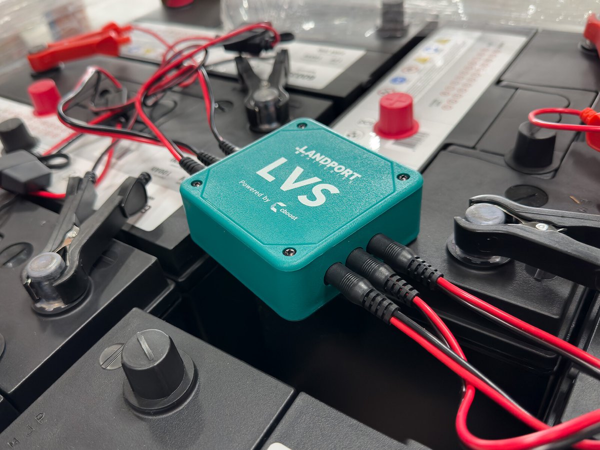 The Landport Voltage Sensor (LVS) is an innovative sensor that wirelessly transmits real-time voltage readings of stored batteries. Each LVS continuously monitors the voltage of six batteries per pallet and periodically sends the data to a monitoring system. A traffic light indicator clearly signals when batteries need charging. Additionally, the LVS tracks the performance of specific batches over time, providing ongoing insights into battery health.